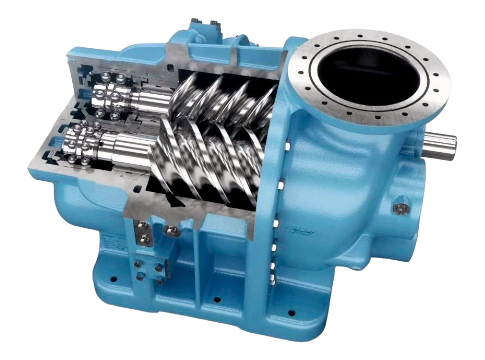 Принцип работы винтовых компрессоров заключается во втягивании газа в пространство между кулачками двух роторов. При вращении роторов профиль роторов обеспечивает подачу газа в непрерывно уменьшающееся в объеме пространство, откуда он поступает к выпускному отверстию компрессора. Компрессоры не создают несбалансированные силы, поэтому для них можно использовать опоры с гораздо меньшей прочностью.